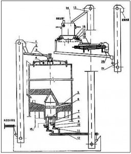 MF生料均化庫(kù)的生料采用分配器和六根斜槽呈輻射狀卸入庫(kù)內(nèi),基本形成水平料層,庫(kù)底是錐形,略向中心傾斜,中部有一中心混合室,中心室與庫(kù)壁之間的均化庫(kù)庫(kù)底分為6-14個(gè)充氣區(qū),每區(qū)設(shè)3條充氣斜槽和3個(gè)卸料孔,卸料時(shí)向兩相對(duì)區(qū)輪流充氣,在卸料中上方出現(xiàn)多股漏斗凹陷,漏斗沿直徑排成一列,隨充氣的交換而旋轉(zhuǎn)角度,這樣不但產(chǎn)生重力混合,而且生料從庫(kù)底卸入中心室后,中心室底部連續(xù)充氣,使生料又獲一次均化,由于這種庫(kù)的均化原理是以料流重力混合為主要手段,所以電耗極省,能耗僅為0.432~0.576Mj/t,均化值H可達(dá)7-10,該系統(tǒng)具有高效節(jié)能,基建投資低和操作管理簡(jiǎn)便等優(yōu)點(diǎn)。